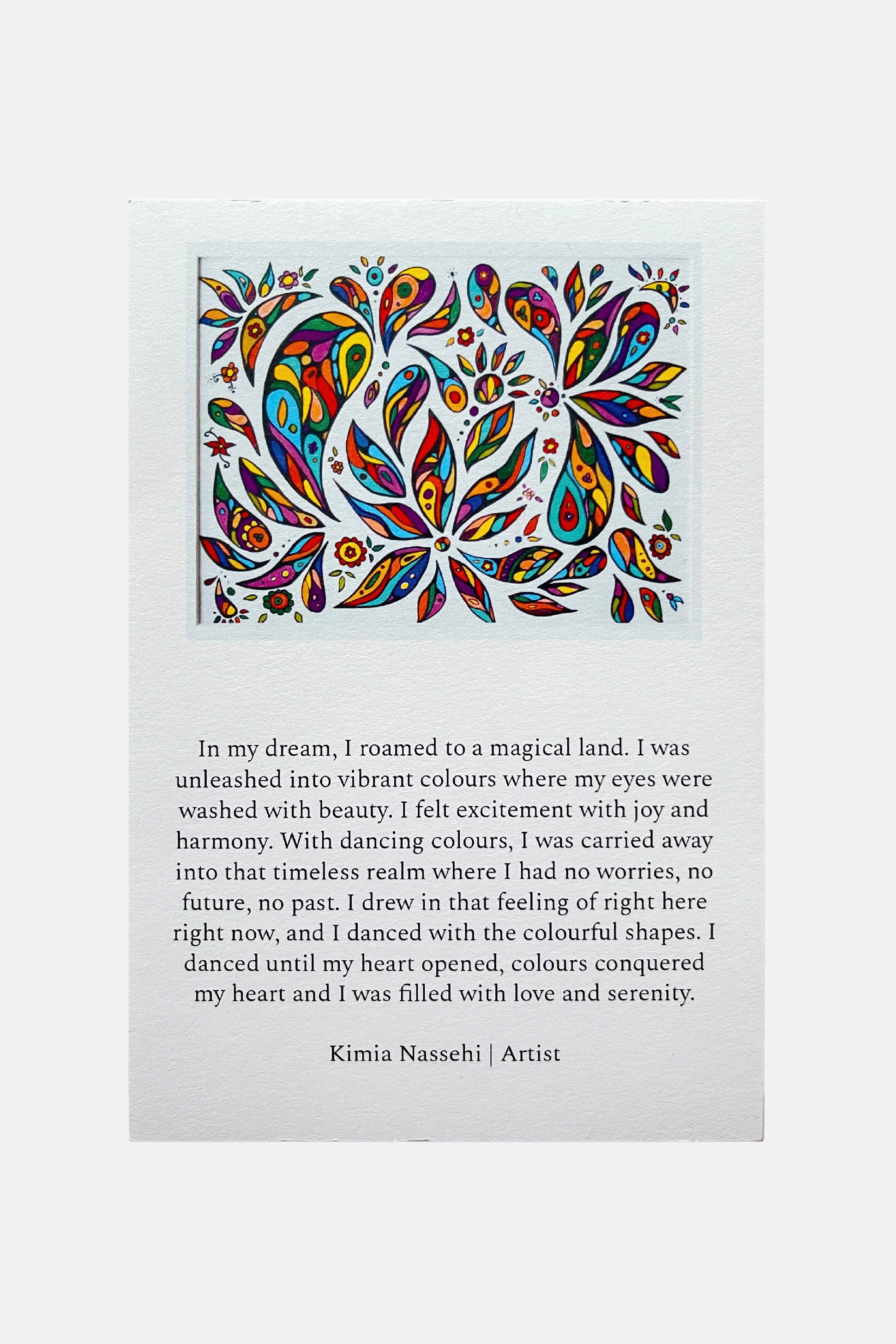 In my dream, I roamed to a magical land. I was unleashed into vibrant colours where my eyes were washed with beauty. I felt excitement with joy and harmony. With dancing colours, I was carried away into that timeless realm where I had no worries, no future, no past. I drew in that feeling of right here right now, and I danced with the colourful shapes. I danced until my heart opened, colours conquered my heart and I was filled with love and serenity.