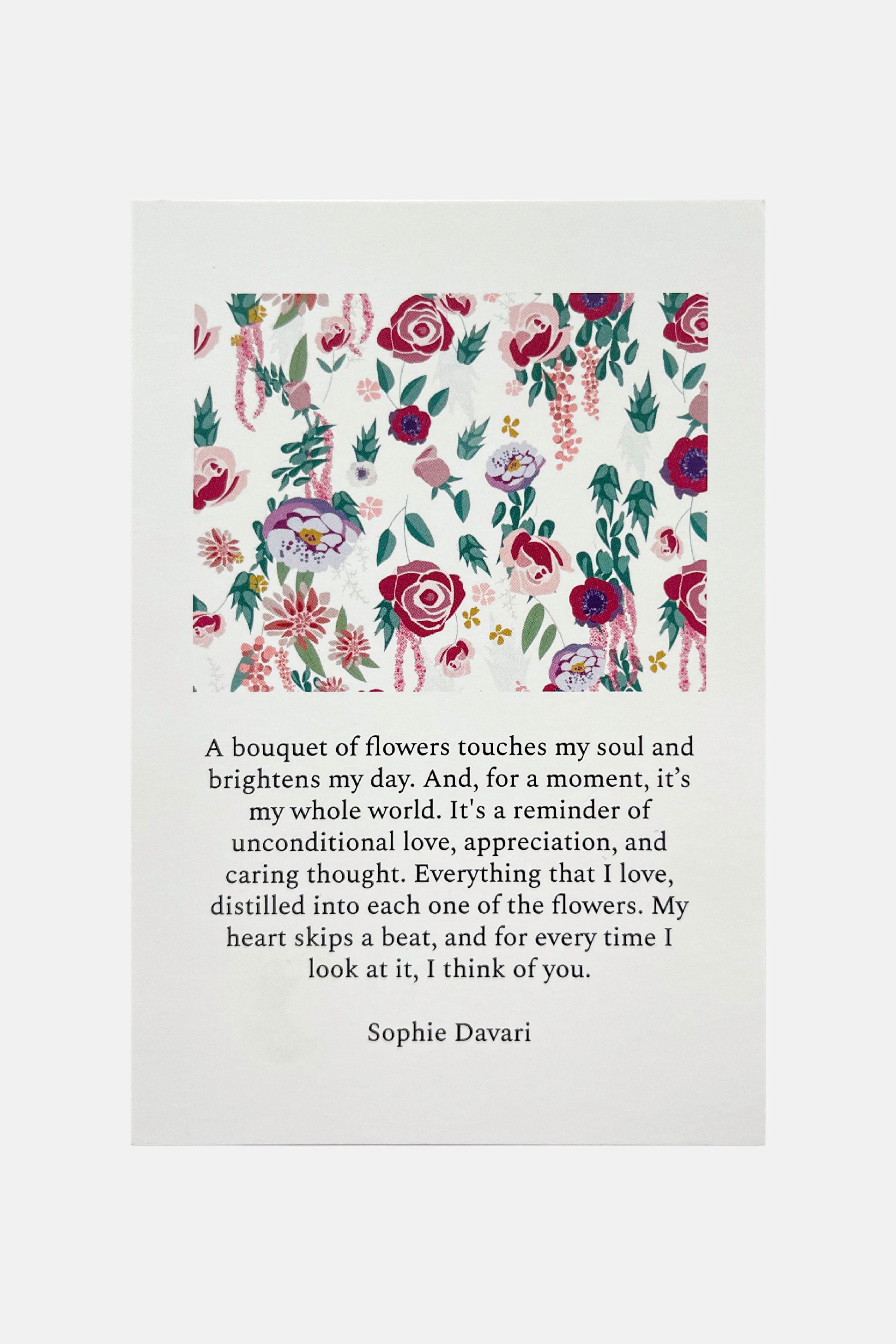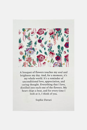 A bouquet of flowers touches my soul and brightens my day. And, for a moment, it’s my whole world. It's a reminder of unconditional love, appreciation, and caring thought. Everything that I love, distilled into each one of the flowers. My heart skips a beat, and for every time I look at it, I think of you.