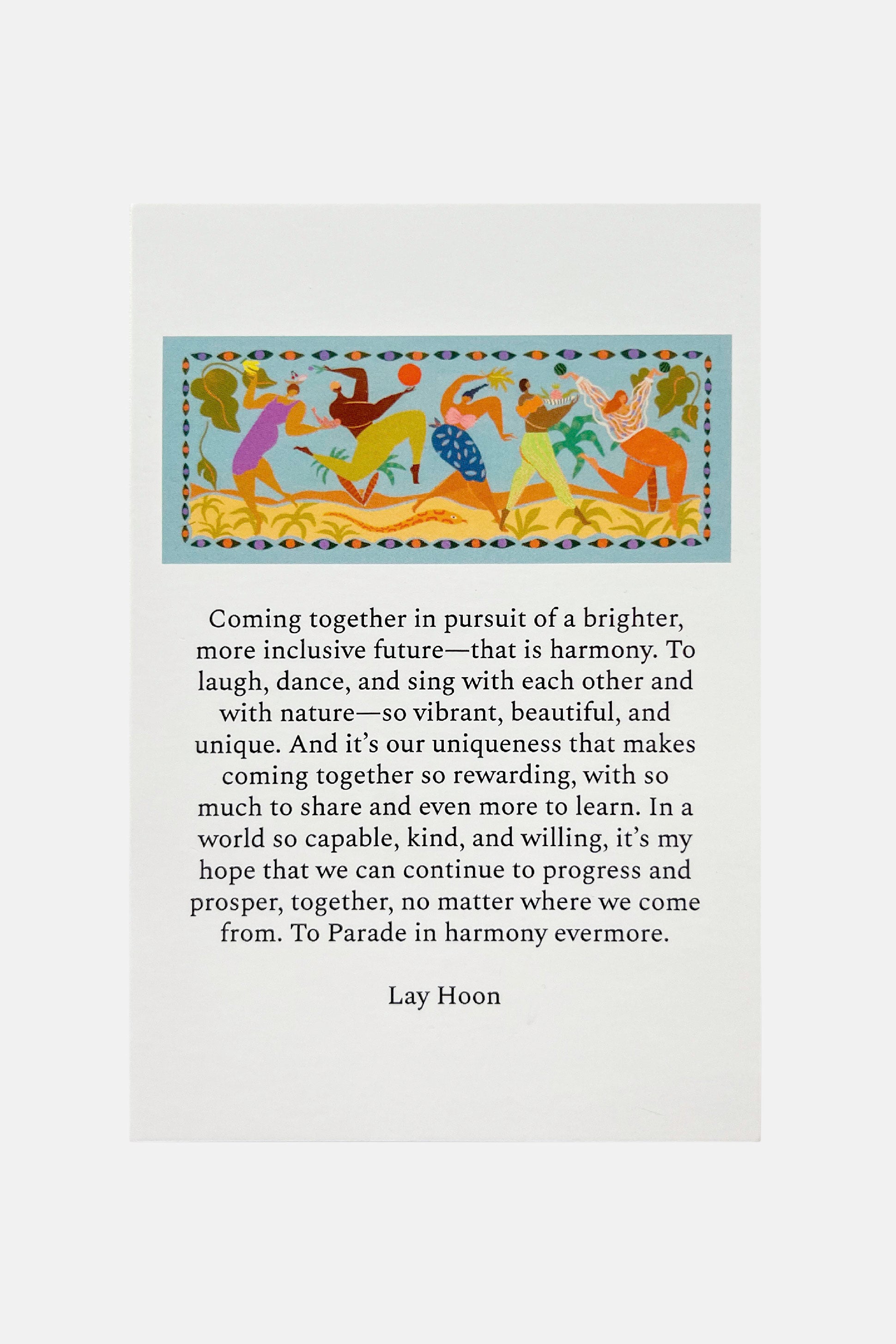 Coming together in pursuit of a brighter, more inclusive future—that is harmony. To laugh, dance, and sing with each other and with nature—so vibrant, beautiful, and unique. And it’s our uniqueness that makes coming together so rewarding, with so much to share and even more to learn. In a world so capable, kind, and willing, it’s my hope that we can continue to progress and prosper, together, no matter where we come from. To Parade in harmony evermore.