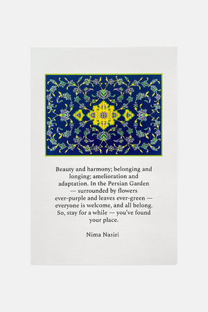 Beauty and harmony; belonging and longing; amelioration and adaptation. In the Persian Garden —- surrounded by flowers ever-purple and leaves ever-green — everyone is welcome, and all belong. So, stay for a while — you’ve found your place.